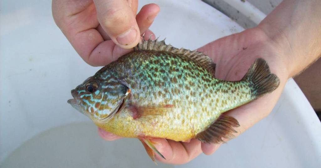 Perche soleil ou Crapet (lepomis gibbosus) Poisson carnassier (larves, insectes, alevins, œufs, batraciens etc.…), originaire d’Amérique du nord et Introduit volontairement pour son aspect décoratif en 1877 et aquariophile